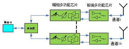 Ku波段16通道T/R組件是集收發一體的多功能模塊,內有16個收發通道,收發通道采用兩片式構架方案即前端多功能以及幅相多功能兩種芯片,工作頻帶寬,集成度高,體積小,組件效率高,同時通道間具有良好的幅相一致性。